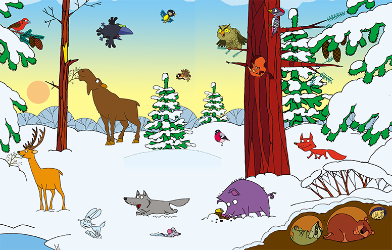 Розглянь малюнок. Які ознаки зими в неживій природі ти бачиш? Який вигляд мають дерева і кущі? Знайди і назви тварин, які шукають корм, і тих, що впали в сплячку.
